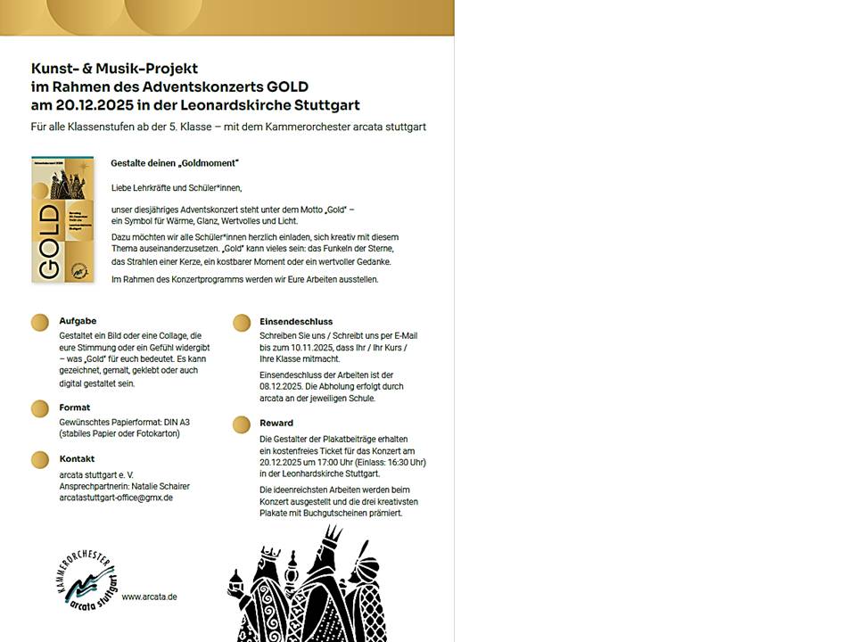ADVENTSKONZERT »Gold«17:00 Uhr Die Adventskonzerte haben seit 18 Jahren Tradition im Konzertprogramm des Kammerorchesters arcata stuttgart. Literatur und Musik im Zwiegespräch! Hier stimmen sich Jung und Alt mit bekannten und unbekannteren Texten und Werken auf Weihnachten ein. Beim diesjährigen Adventskonzert "Gold" erklingen ganz besondere Werke im Wechselspiel mit Texten. Umrahmt wird das Konzert mit einer Plakat-Ausstellung von Schüler:innen. Plakat-Ausstellung von Schüler:innen Im Rahmen des Konzertprogramms findet eine Plakat-Ausstellung zum Kunst-Mitmachprojekt von Schüler:innen zum Konzertthema „Gold“ statt. Die drei kreativsten Plakate werden mit Buchgutscheinen prämiert. Schulklassen ab der 5. Klasse, Berufsfachschulen und Hochschulen können sich für die Teilnahme bis zum 08.11.2025 anmelden unter: arcatastuttgart-office@gmx.de Programm Georg Friedrich Händel: Suite in D für Trompete, Streicher und b.c. Texte von Rainer Maria Rilke, Eduard von Schenk, Karl Emil Quandt, Anonym, Margaret Fishback Powers Solist: Christof Skupin, Trompete Vorverkauf oder an der Abendkasse Eintritt: 20,00 € - ermäßigt 10,00 € (Schüler, Studierende, Schwerbehinderte) Inhaber*innen der Bonuscard + Kultur erhalten Freikarten. |